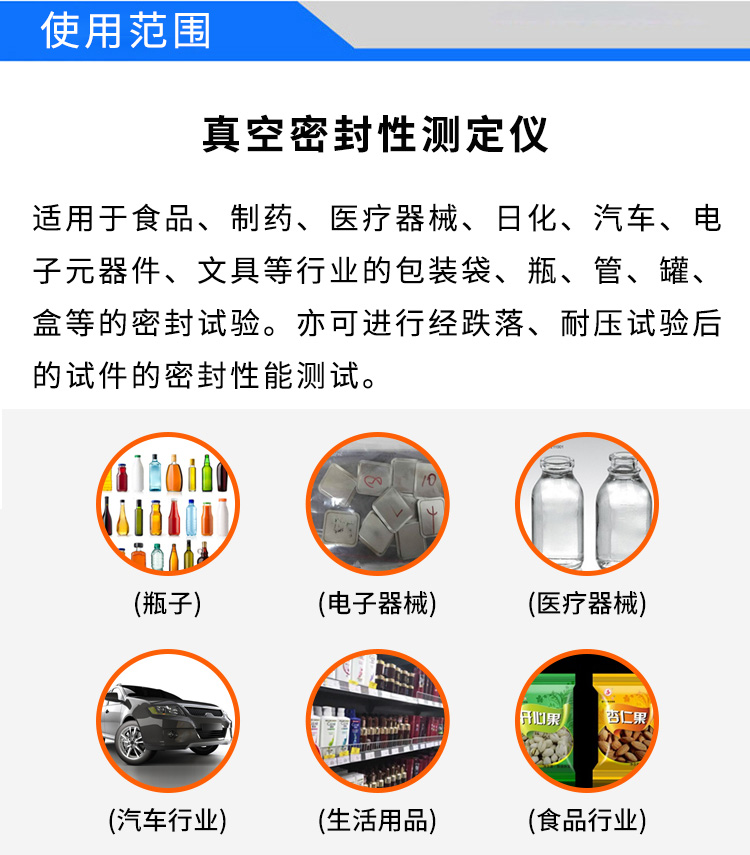產品用途:適用于食品、制藥、醫療器械、日化、汽車、電子元器件、文具等行業的包裝袋、瓶、管、罐、盒等的密封試驗。亦可進行經跌落、耐壓試驗后的試件的密封性能測試